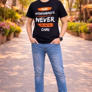 Stylish black graphic T-shirt made from soft, breathable 100% cotton, featuring the bold print “HUM HYDERABADI’S NEVER SAY NO TO CHAI.” Perfect for casual wear, comfort, and everyday street style.