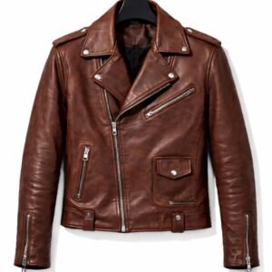 Stylish women’s brown leather biker jacket with a sleek fitted design, high-neck collar, front zip closure, and chest zip pockets. Crafted for a modern, confident look—perfect for casual wear, riding, and everyday styling.