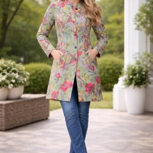 Stylish women’s reversible long jacket featuring an elegant floral print, offering two looks in one. Crafted from lightweight, breathable fabric with a flattering long line fit—perfect for casual wear, travel, and effortless layering.