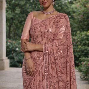Elegant peach saree featuring all-over sequin embellishments and a graceful drape. Made from lightweight fabric with a matching blouse piece, perfect for weddings, parties, and festive occasions.