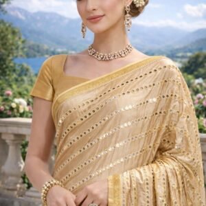 Elegant golden saree featuring delicate mirror-style embellishments and a graceful drape. Crafted from lightweight fabric with a matching blouse piece, perfect for weddings, festive occasions, and special celebrations.