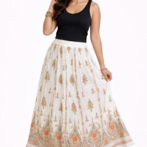 Elegant off-white flared skirt crafted from soft rayon crepe, featuring delicate floral prints and a traditional ethnic border for a graceful, comfortable look.