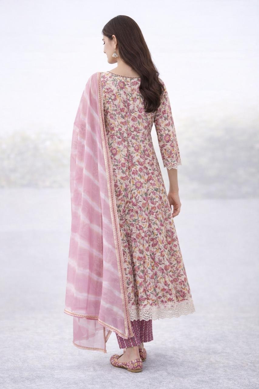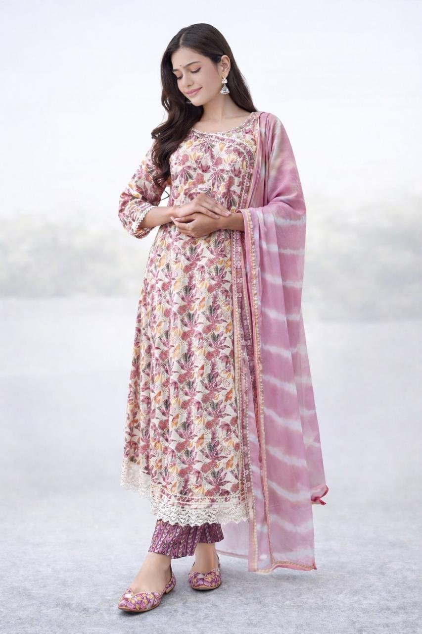 Paired with a fully stitched premium printed cotton bottom and a heavy chiffon dupatta featuring Lahariya print and elegant four-side lace border, this set is completely ready to wear and offers both comfort and luxury.
