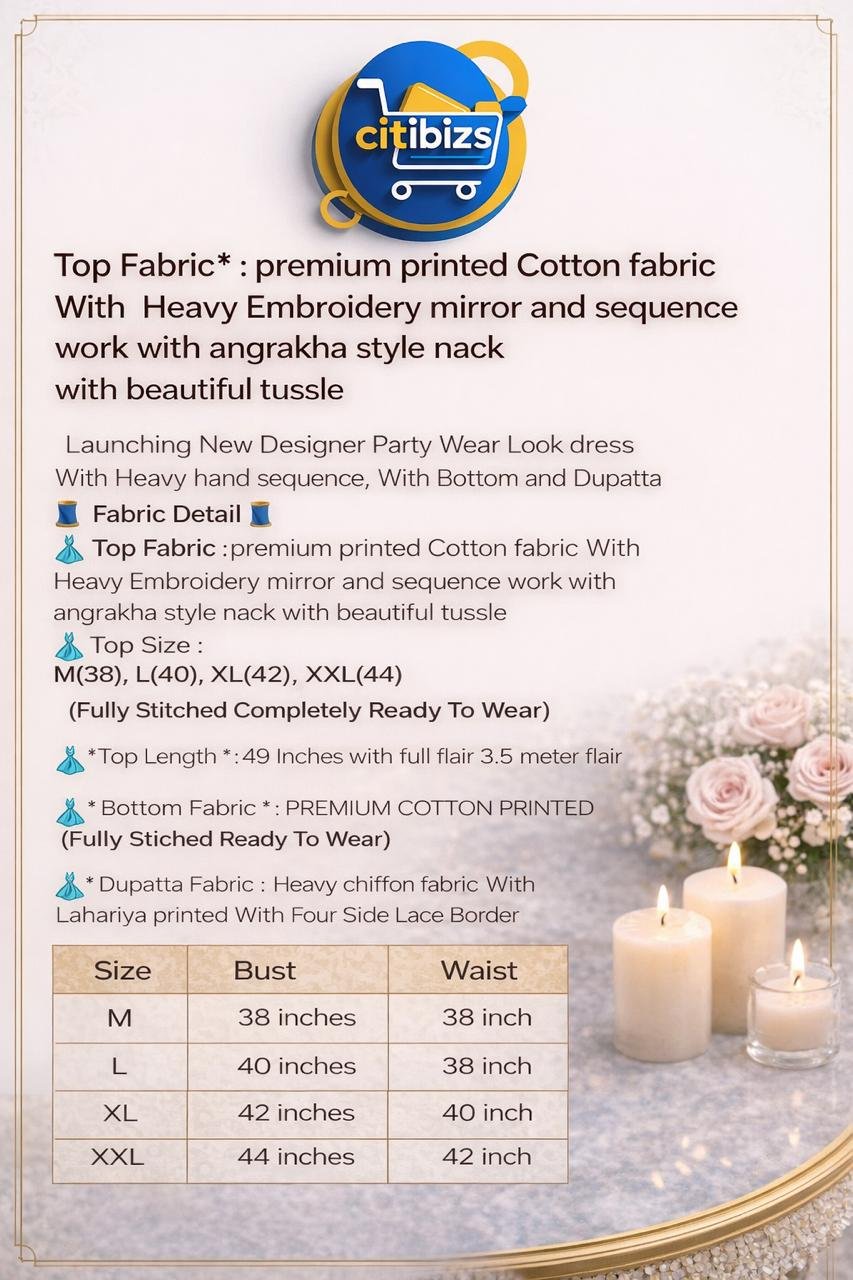 Designer Cotton Party Wear Suit Set featuring a premium printed cotton top with heavy embroidery, mirror & sequin work, stylish Angrakha neck with tassels, paired with a fully stitched cotton bottom and heavy chiffon Lahariya dupatta with 4-side lace border. Ready-to-wear, elegant, and perfect for festive & party occasions.