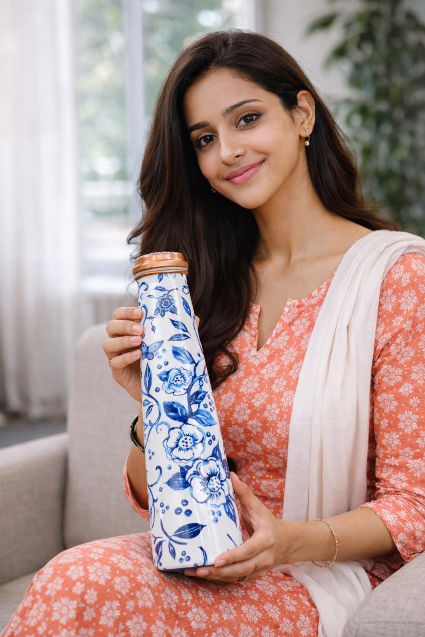 100% pure copper water bottle with a premium printed design and leak-proof cap. Eco-friendly, durable, and ideal for daily use, travel, and gifting while supporting a healthy lifestyle.