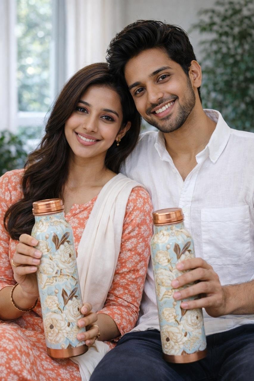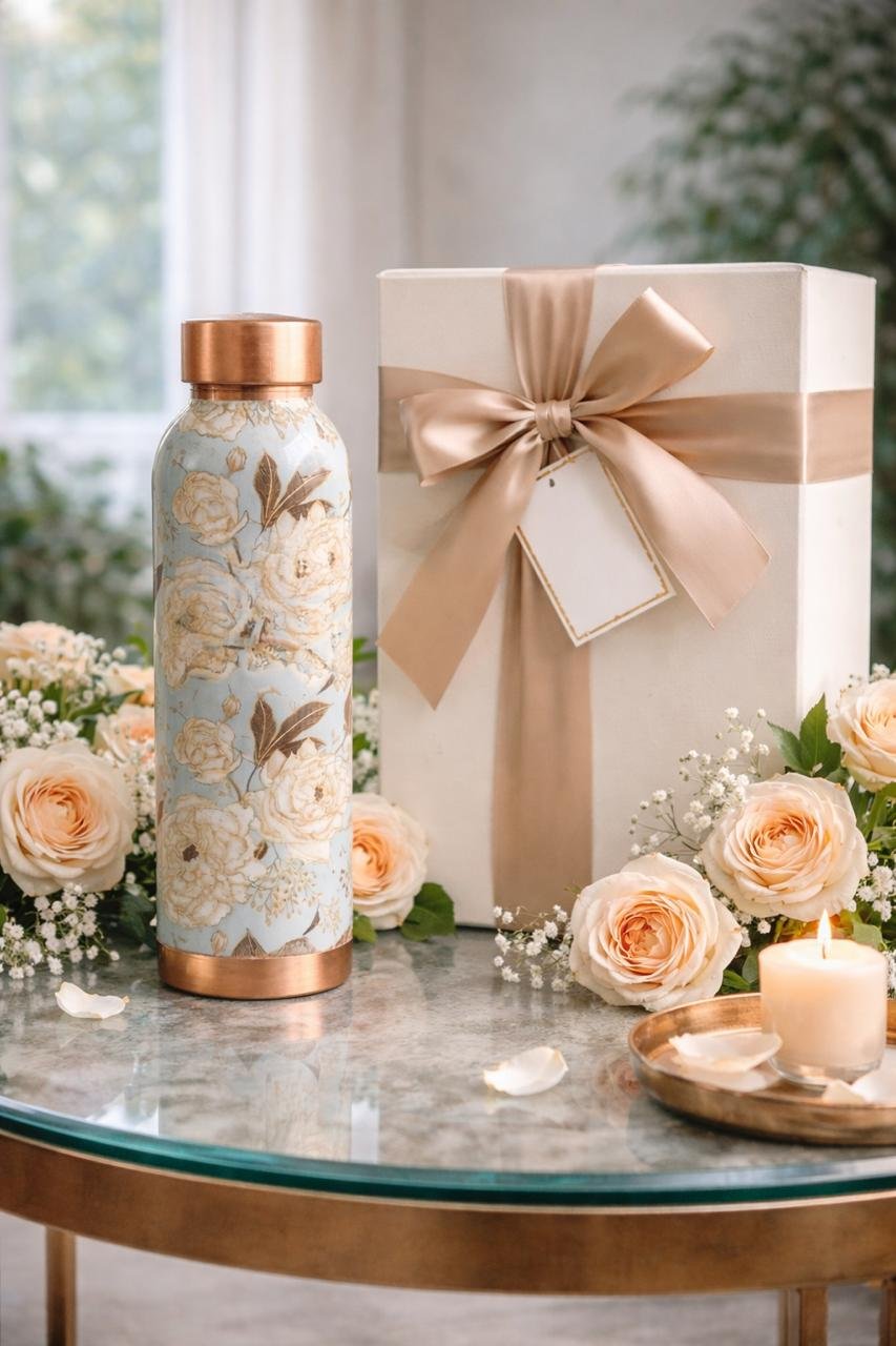 Experience the goodness of tradition with this 100% pure copper water bottle, beautifully crafted with an elegant printed finish. Designed to combine health benefits with luxurious aesthetics, this bottle is ideal for daily use at home, office, gym, or travel.
