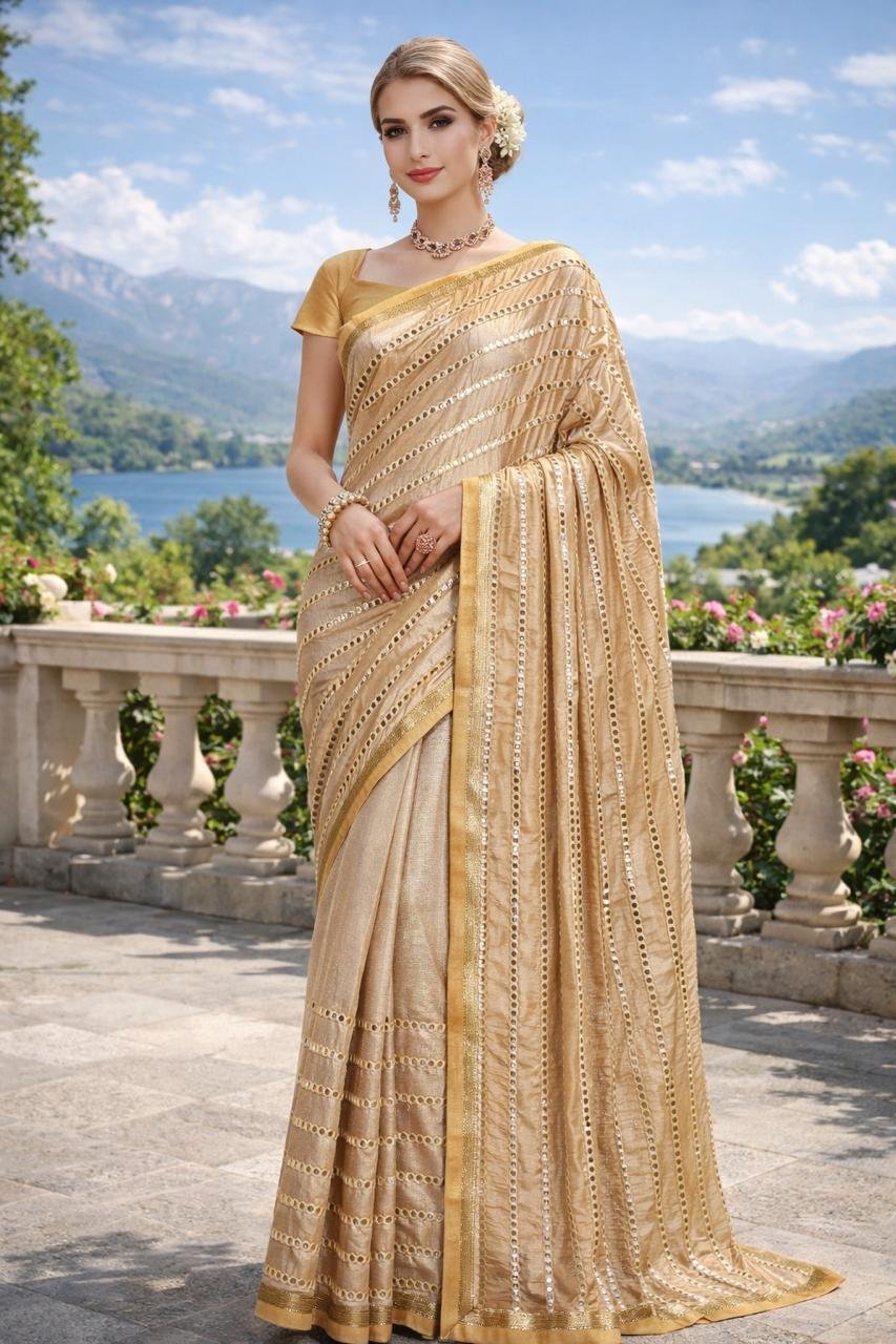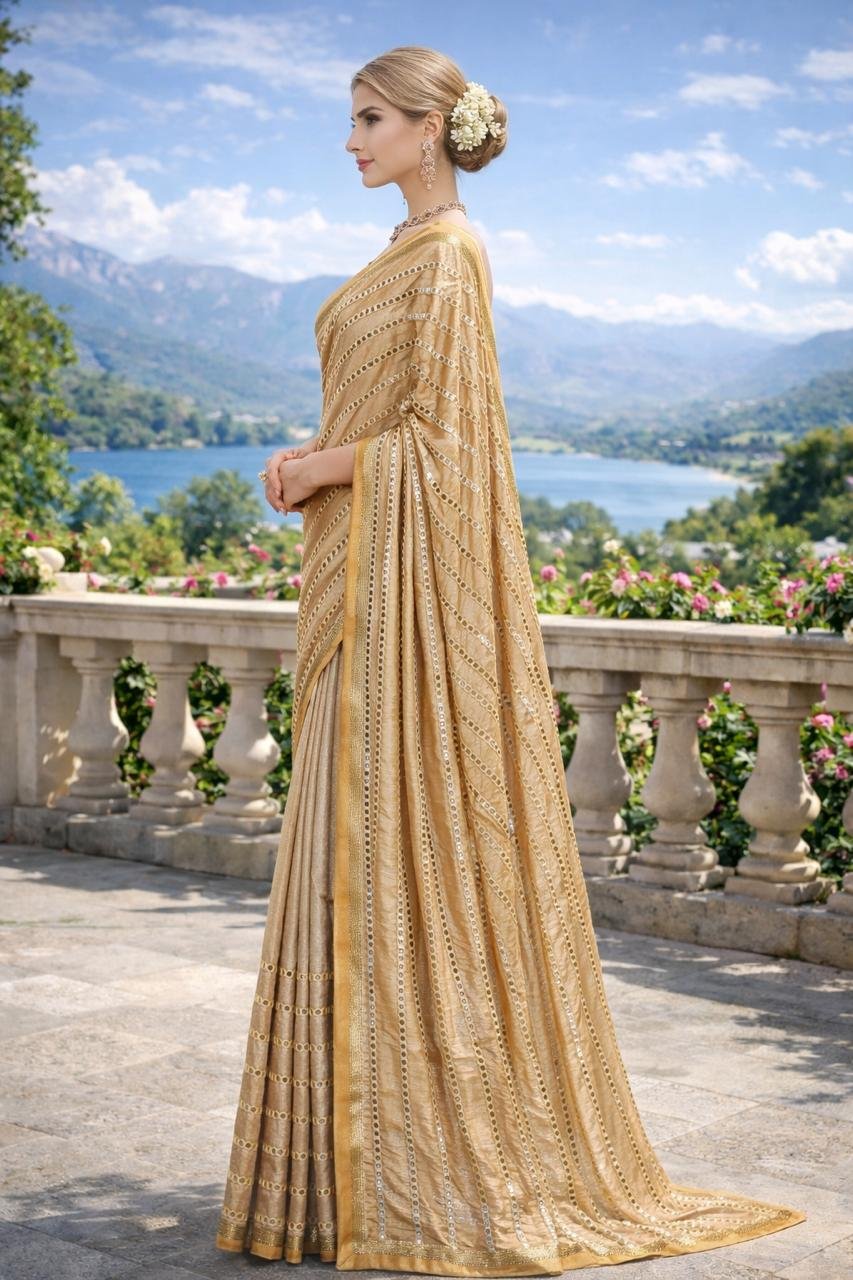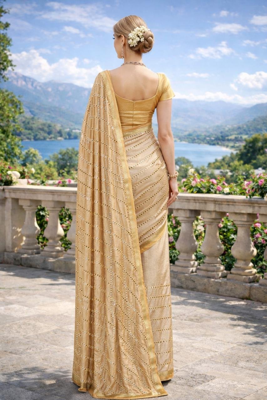 Elegant golden saree featuring delicate mirror-style embellishments and a graceful drape. Crafted from lightweight fabric with a matching blouse piece, perfect for weddings, festive occasions, and special celebrations.